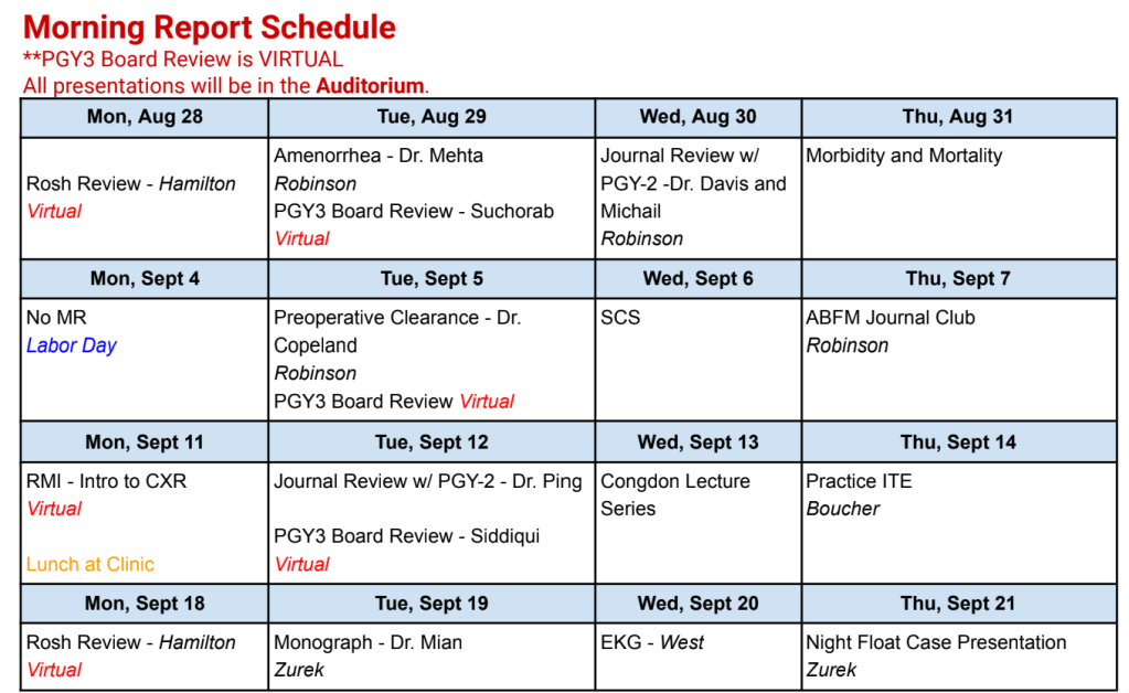 Morning report is from 7:15am – 8:00am Monday through Thursday unless otherwise noted. It is mandatory for every resident to join unless they are on an excused rotation or PTO. Morning report is usually conducted by our residents and faculty or specialists including radiologists, cardiologists, pulmonologists and surgeons. Throughout the year every resident is required to give lectures on topics of their choice. The Night Float Team for that block is charge of doing an interactive case presentation during the fourth week of the block. See an example of our morning report schedule below: