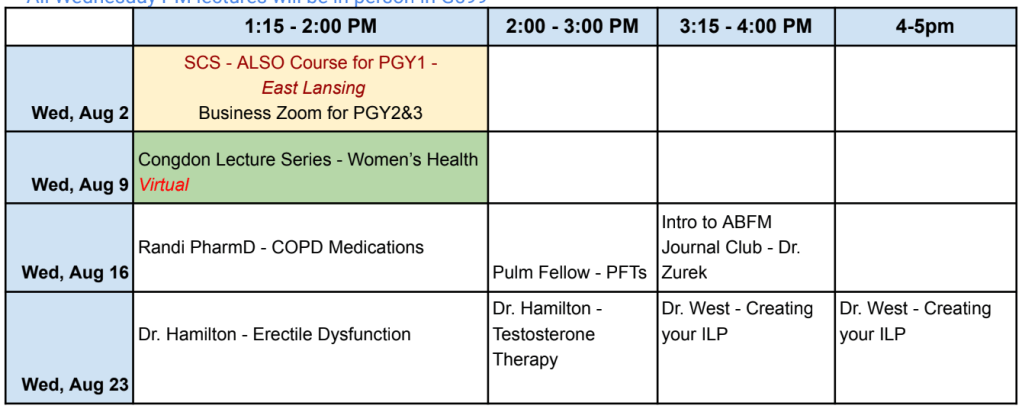 Didactics are every Wednesday from 1:00pm – 5:00pm unless otherwise noted. This is protected time for education. With the exception of limited team, all other residents are excused from patient care to participate in didactic. Residents get to be a part of interactive bootcamps, procedure and leadership workshops, and Congdon or SCS conferences. Lectures are usually given by different specialists or by our faculty. See a sample of our didactic schedule below: